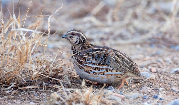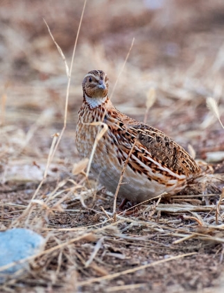 鉴别特征:体长约17 cm,小型鹑类。与人工饲养的鹌鹑相似,身材较圆,上体具褐色和黑色横斑及皮黄色矛状长条纹,头具较明显的白色眉纹。