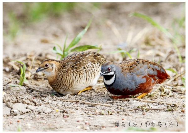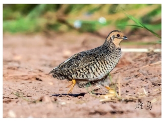鉴别特征:体长约14 cm,小型鹑类。上体多褐色,有较明显的白色纵纹和黑色横纹。雄鸟喉部具黑白色图案,腹部栗色。雌鸟喉部和腹部黄白色。