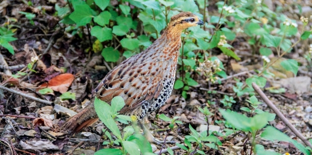 鉴别特征:体长约34 cm,体形中等的鹑类。体羽多灰褐色,头部具黑色的眼纹和黄白色的眉纹。上胸栗色,下胸和腹部具明显的黑色斑点。雌雄相似。