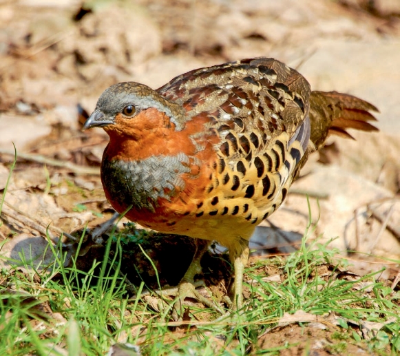 鉴别特征:体长约33 cm,体形中等的鹑类。上体多橄榄褐色,上胸和喉部等具灰色和黄色的特征性图案,两胁和上背具明显的褐色斑点。雌雄相似。