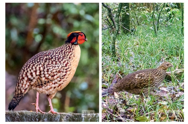 鉴别特征:体长约58 cm,体形较大的雉类。雄鸟体羽多栗褐色,上体具较大的皮黄色斑点,头黑,脸部裸皮橘黄色,下体棕黄色。雌鸟灰褐色,杂以白色矛状细纹。