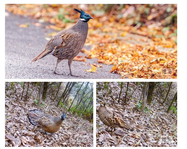 鉴别特征:体长约58 cm,体形大但尾较短的雉类。头黑色,具明显的冠羽和耳羽束,颈部具白斑。体羽褐色,具黑色的矛状纹。雌鸟具冠羽但无长的耳羽束。
