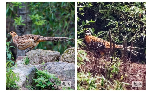 鉴别特征:体长可达180 cm(雄鸟)或70cm(雌鸟)的大型雉类。雄鸟头顶、颈圈和眼下白色,背部与上胸金黄色,尾极长。雌鸟偏褐色,头顶和后颈暗栗褐色,尾较短。