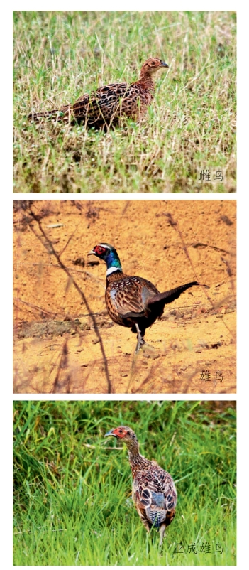 鉴别特征:体长约85 cm,体形较大的雉类。雄鸟多红褐色,头部具黑色光泽,红色的眼周裸露明显,尾长并具黑色的细横纹。雌鸟褐色,具较多的浅褐色斑点。torquatus和takatsukasae亚种体色稍有区别。