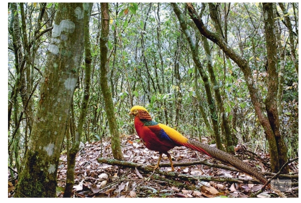 鉴别特征:雄鸟体长可达110 cm,体形中等但尾部特别长的雉类。体羽主要由金黄色和红色组成。雌鸟多褐色,上体具黑色横斑,下体皮黄色。