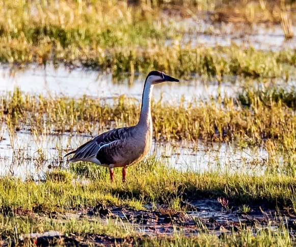 鉴别特征:体长约90 cm,体形较大的游禽。体羽灰褐色,前颈白色,后颈暗褐色。成鸟的额基与喙之间有一条白色细纹。雄鸟上喙基部有一较明显的疣状突。