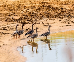 鉴别特征:体长约72 cm,体形较大的游禽。体羽多灰色,尾上覆羽和腹部白色,夹杂黑色块斑,喙粉红色,白色块斑环绕喙基。