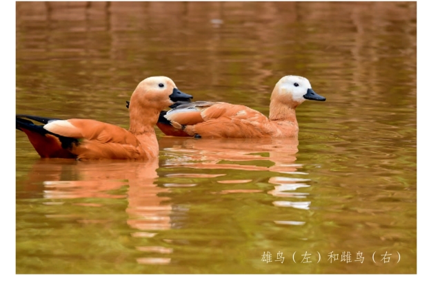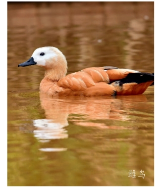 鉴别特征:体长约60 cm,体形较大的鸭类。体羽多赤黄色,翼具白色斑块和铜绿色翼镜。雄鸟繁殖羽具黑色颈圈。