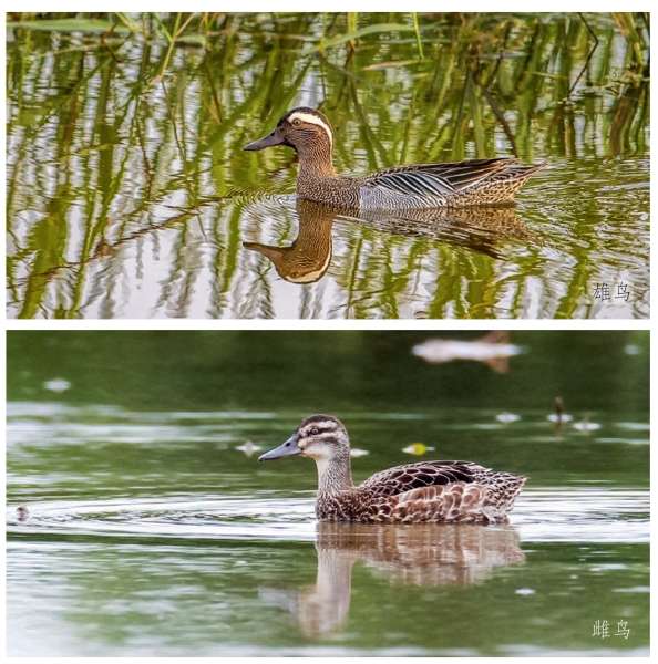 鉴别特征:体长约37 cm,体形较小的鸭类。雄鸟头颈栗色,具明显的白色眉纹,腹部白色。雌鸟体羽褐色,眉纹较明显。