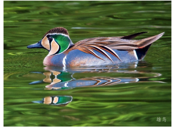 鉴别特征:体长约40 cm,体形较小的鸭类。雄鸟脸部具明显的绿色、黄色、黑色花纹,容易识别。雌鸟喙基有白色的斑点,脸侧具不明显的花纹。