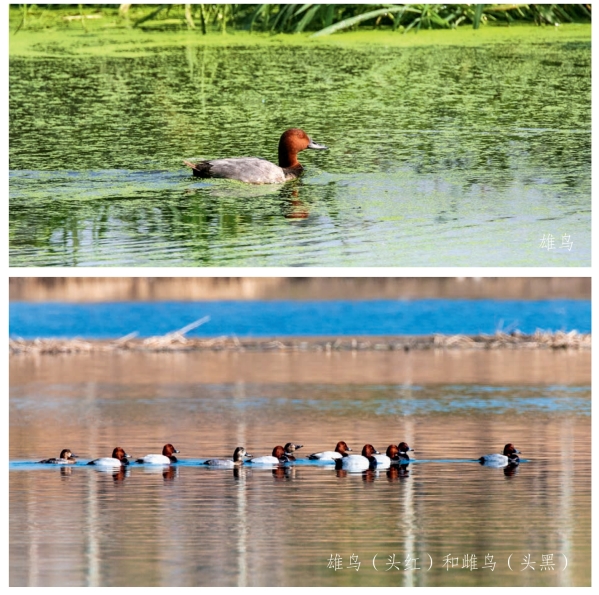 鉴别特征:体长约45 cm,体形中等的鸭类。雄鸟头栗色,喙黑色,颈和上胸黑色,其余部分灰白色。雌鸟淡棕色,翼灰色。