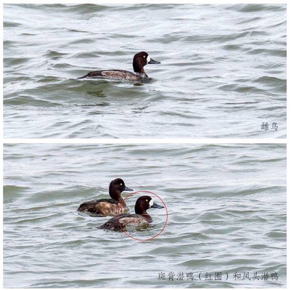 鉴别特征:体长约45 cm,体形中等的鸭类。雄鸟头和颈黑色,背部多白色,具黑色的细纹。雌鸟多褐色,腹部灰白色,喙基具白色宽环。