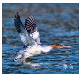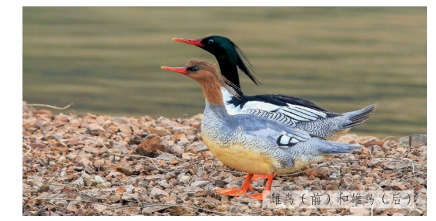 鉴别特征:体长约55 cm,体形较大的鸭类。红色的喙前端呈钩状。雄鸟头部、颈部、上背和羽冠黑色,下体白色,两胁具鳞状黑色细纹。雌鸟头和羽冠为棕褐色。