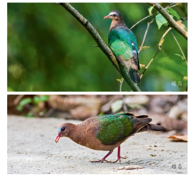 鉴别特征:体长约25 cm,体形中等、尾甚短的地栖型斑鸠。雄鸟头顶灰色,额白色,两翼具亮绿色,腰灰色,下体粉红色。雌鸟头顶无灰色。喙均为红色。