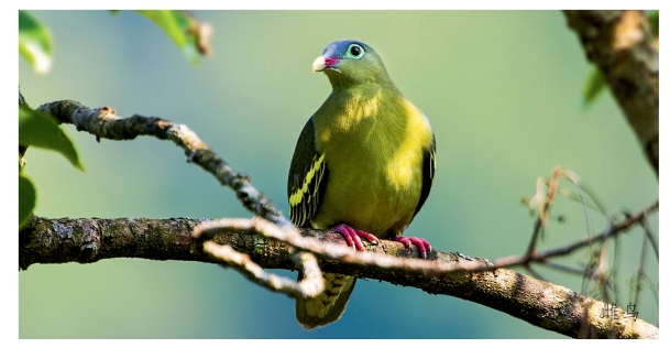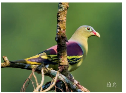 鉴别特征:体长约27 cm,体形中等、身体厚实的绿鸠。眼周裸皮蓝绿色。雄鸟上体多绛紫色,翼具黄色羽缘和明显的黄色翼斑。雌鸟上体多深绿色。
