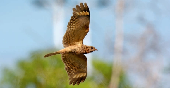 鉴别特征:体长约26 cm,小型夜鹰类。上体黑褐色,布满浅棕色细斑纹,喉两侧具白斑,下体皮黄色,具浅色横斑,雄鸟一对外侧尾羽白色。栖息地:低地开阔地带的丘陵、平原和海滨林地。