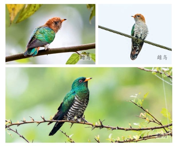 鉴别特征:体长约17 cm,小型辉绿色鹃类。雄鸟头、颈、胸和其余上体亮绿色,腹白色且具绿色横斑。雌鸟头、枕棕色,上体其余部分绿色,下体白色且具黄褐色横斑。