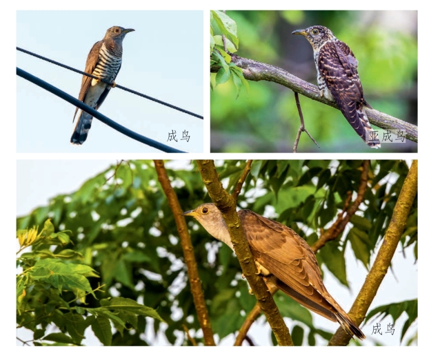 鉴别特征:体长约32 cm,中型偏灰色鹃类。上体和胸部灰色,翅形尖长,腹白色具黑色横斑,斑纹较粗且疏,尾具黑色次端斑。鸣声似“光—棍—好—苦”,四声一度。雌鸟胸染棕色,其他似雄鸟。