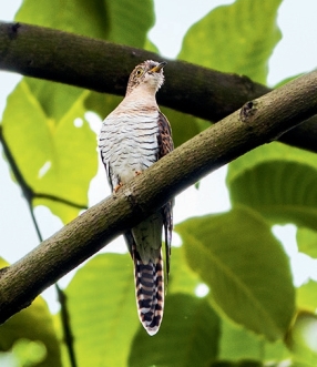 鉴别特征:体长约32 cm,中型鹃类。头和上体灰色,腹部白色具细且密的黑色横斑,翅尖长。鸣声似“布—谷”,两声一度。bakeri亚种下体横斑较粗黑,横斑宽度一般达到2mm。