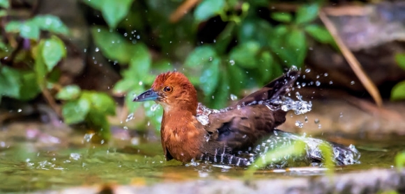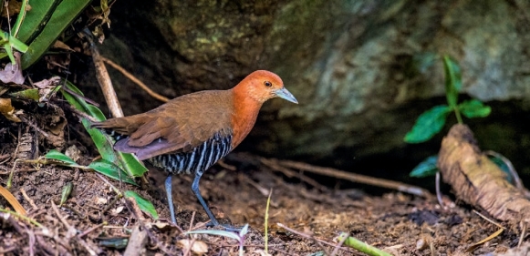 鉴别特征:体长约25 cm,体形中等的秧鸡。头和胸栗色,上体其余部分褐色,颏部偏白色,腹部黑色,具明显的白色横纹。