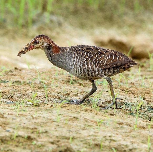 鉴别特征:体长约26 cm,体形中等的秧鸡。头顶栗色,背多具白色细纹,下体灰色,两胁和尾下具较粗的黑白色横斑。