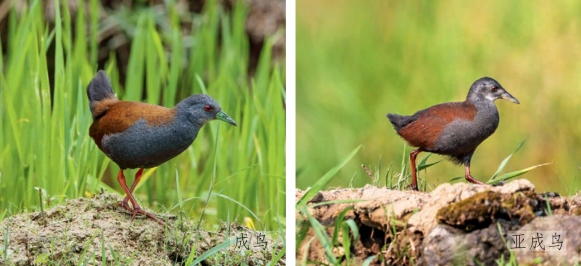 鉴别特征:体长约22 cm,体形中等的秧鸡。头和下体烟灰色,颏部颜色较淡,背部橄榄褐色。