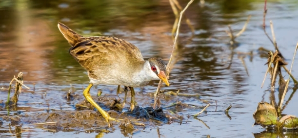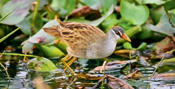 鉴别特征:体长约20 cm,体形稍小的秧鸡。体羽多灰褐色,上体具黑色斑点,具黑色的贯眼纹和白色的眉纹。