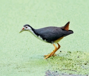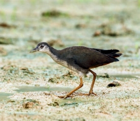 鉴别特征:体长约34 cm,体形稍大的秧鸡。上体青灰色,脸部和下体几乎为白色,但臀部棕色。喙偏绿色,基部红色。