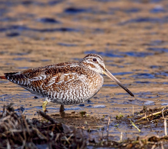 鉴别特征:体长约29 cm,体形略大的深色沙锥。体羽色较暗,黄色较少,斑纹较细。头顶中央冠纹、眉纹、颊为白色而非皮黄色,胸浅姜棕色,偏白色的下体布满褐色横斑,背部两侧均具4条白色纵纹。喙黄绿色,喙端黑色。脚黄绿色。