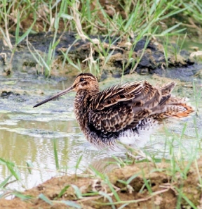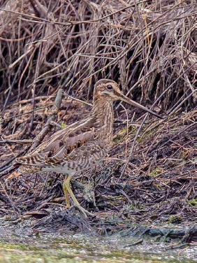 鉴别特征:体长约26 cm,中型沙锥。外侧尾羽宽,但不易看到。脸皮黄色,喙相对长(约为头长的2倍)。背部花纹较粗糙,黄色条纹明显。贯眼纹较模糊且较宽泛。飞行时次级羽具白色宽后缘,翼下具白色宽横纹。腿短粗,为橄榄色。