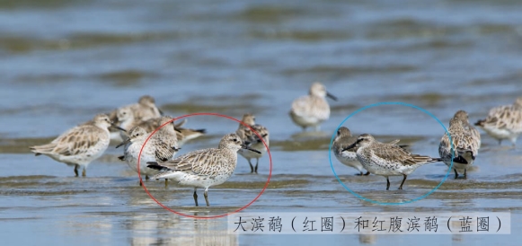 相似种:红腹滨鹬。体形略小,脚略短,相对矮壮,喙略短,浅白色的眉纹明显,飞行时尾基色深。