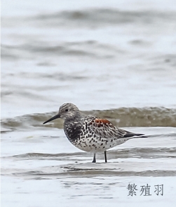 鉴别特征:体长约27 cm,中型灰色滨鹬。喙略长且厚,黑色。冬羽胸色暗且布满小斑点,两胁具细斑点,腰和两翼具白色横斑。繁殖羽的胸黑色较深,白色的下体具较黑较大的斑点,翼具赤褐色横斑。飞行时尾基白色,脚绿灰色。