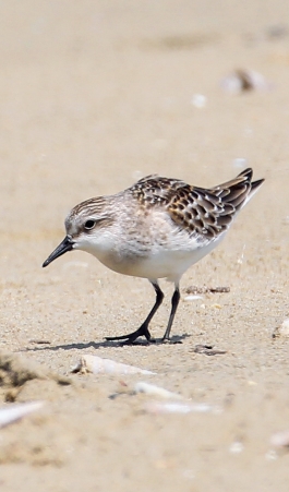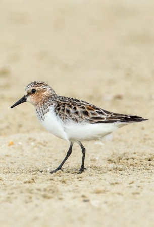 鉴别特征:体长约15 cm,小型滨鹬。喙短,略粗,全黑色。冬羽上体灰褐色,下体白色,胸两侧微具灰色纵纹。繁殖羽上体羽色深,头、颈、背、肩红褐色,脚黑色。