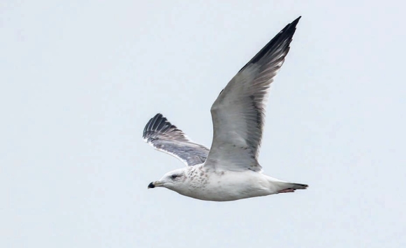 鉴别特征:体长约62 cm,体形较大的鸥类。上体深灰色,通常三级飞羽和肩部具白色的月牙形宽斑。合拢的翼上可见多至五枚大小相等的突出白色翼尖。冬羽成鸟头和颈背具深色纵纹,并及胸部。飞行时于第十枚初级飞羽上可见中等大小的白色翼镜,第九枚具较小翼镜。脚粉红色。