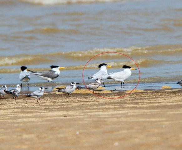 鉴别特征:体长约38 cm,体形中等的具冠羽的燕鸥。喙黄色,喙端黑色。繁殖期头顶和冠羽黑色,其余部位偏灰色或白色。非繁殖期额白色,冠羽黑色且具白色顶纹。幼鸟多褐色和白色杂斑。
