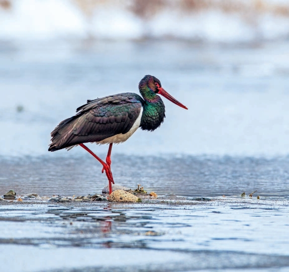 鉴别特征:体长约105 cm,体形很大的水鸟。上体黑色,具金属光泽,胸、腹和尾下白色,喙和腿红色。