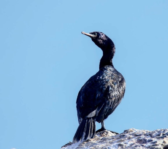 相似种:普通鸬鹚。体形稍大,体羽深褐色,颊部和喉部白色。