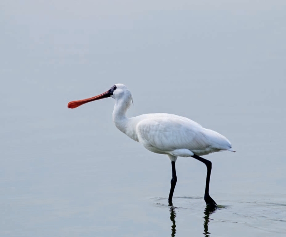 鉴别特征:体长约70 cm,体形较大的水鸟。全身羽毛白色,喙扁平似琵琶。前额、眼线、眼周至喙基的裸皮黑色。