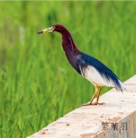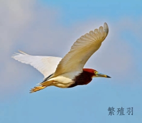 鉴别特征:体长约47 cm,体形略小的白色鹭鸟。繁殖期头和颈深栗色,胸酱紫色。非繁殖期上体几乎全为褐色,颈部和胸部具深色条纹。亚成鸟与成鸟冬羽较为相似。