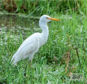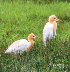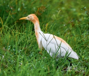 鉴别特征:体长约50 cm,体形略小的白色鹭鸟。体形较粗壮,颈粗头圆。繁殖期头、颈、胸沾橙黄。非繁殖期体羽全白,喙黄色。