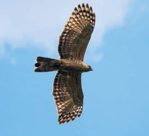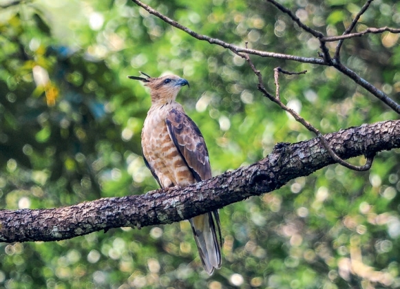 鉴别特征:体长约55 cm,体形中等的猛禽。全身近褐色,头顶有由2~3枚羽毛构成的长黑色冠羽。飞行时翼指6枚,翼较宽大。