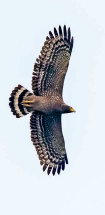 鉴别特征:体长约67 cm,大中型猛禽。上体暗褐色,下体土黄色,具白色虫眼斑,头顶常居冠羽,眼和喙之间的裸皮呈黄色。飞行时翼指7枚,翼和尾后部的白斑较明显。