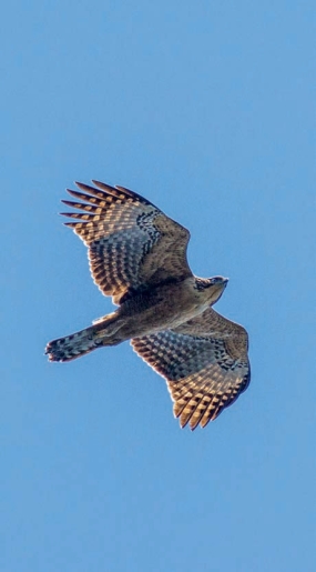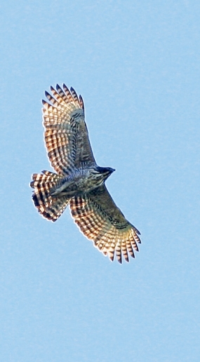 鉴别特征:体长约74 cm,中大型猛禽。上体褐色,有明显的冠羽。下体白色,具黑色的纹。亚成鸟颜色会随着年龄的增大而变化。飞行时翼指7枚,尾具5~6条黑色横带。