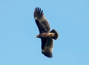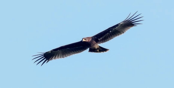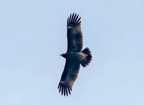 鉴别特征:体长约65 cm,中大型猛禽。通体颜色较暗,翼下初级飞羽基部有淡色月牙斑,飞行时翼指7枚。体羽颜色会随年龄的变化而变化,幼鸟背部和翼部具白色斑点。