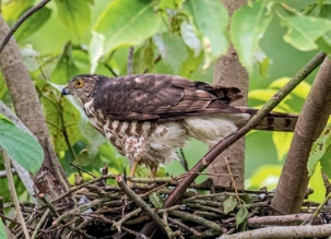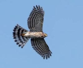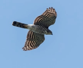 相似种:日本松雀鹰。成鸟喉中线几乎不见,亚成鸟喉中线相对较细,翼指也较细,翼后缘比较直,飞羽深色横斑较细。