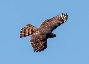 鉴别特征:体长约33 cm,小型猛禽。上体黑灰色,喉白色且喉中线宽阔明显,亚成鸟喉中线相对较细。胸腹部具褐色横纹或纵纹,飞行时翼指5枚。