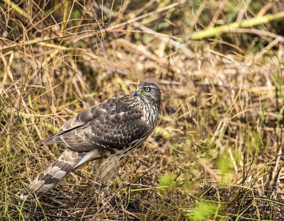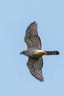 鉴别特征:体长约55 cm,中型猛禽。上体灰褐色,下体白色,密布黑色细横纹。大部分个体可见清晰的白色眉纹。亚成鸟胸腹部有深褐色纵纹。飞行时翼指6枚。