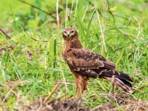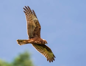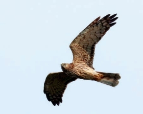 相似种:白尾鹞。雄鸟头与身体羽色对比较不明显,雌鸟翼下初级飞羽横斑相对清晰。
