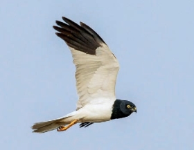 鉴别特征:体长约46 cm,中型猛禽。雄鸟头、喉和胸部黑色,其余部分为白色。雌鸟多褐色,腹部白色。飞行时翼指5枚。黑色的头部与白色的腹部对比明显。