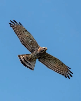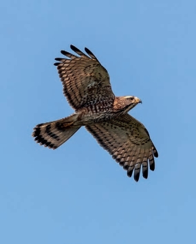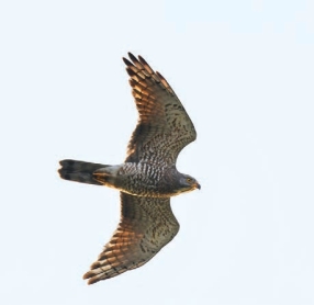 鉴别特征:体长约43 cm,中型猛禽。上体棕褐色,胸腹部密布红褐色横纹,喉中线较为明显。飞行时翼指5枚,端部发黑。成鸟具明显的白色眉纹。